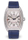 Pre.owned_1200 MC L Franck Muller This Men's watch has 32 x 45 mm 18K White gold case and fixed bezel. Silver dial with Arabic hour markers and blue-tone hands. Day of the week indicator is located at 11 o'clock position. Month indicator is located at 1 o'clock potion. Moon phase...