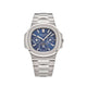 The Patek Philippe Ladies Nautilus features a round octagonal shape diamond-set bezel and 35.2mm stainless steel construction. The watch has a blue embossed dial with gold applied numerals and hour markers with dual timezones for local and home time indication. It is finished with a stainless steel bracelet and fold-over...
