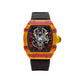 The Richard Mille RM 11-03 is designed in a 50mm rose gold case and styled on a rubber strap. It features a skeletonized dial with white numerals, offering analog time function, flyback chronograph, 60-minute countdown timer and oversized date display. The black rubber bracelet embodies the brand's signature racing aesthetic.