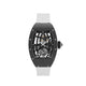 This Richard Mille RM 029 is crafted in a white gold case measuring 48mm. The case is adorned with factory market diamonds, surrounding a transparent dial. The watch comes on a black rubber bracelet.