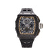 The Richard Mille RM 11-03 is designed in a 50mm white ceramic and titanium case, styled on a rubber strap. An inner ivory ring surrounds a skeletonized case that offers a glimpse into the intricate mechanics of the watch. Complications include analog time function, flyback chronograph, 60-minute countdown timer and...